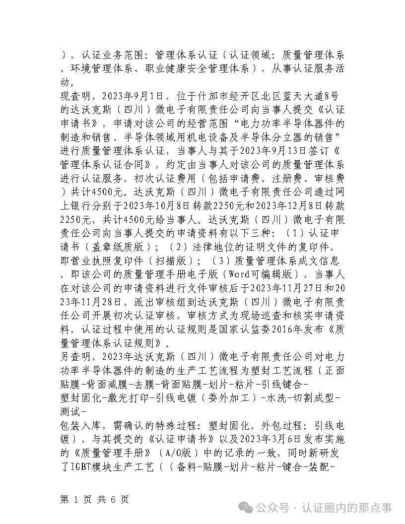 2025年2月,什邡市市场监督管理局接到线索:中亿联合检验认证(成都)有限公司在对达沃克斯(四川)微电子公司的质量管理体系认证中,存在严重违规行为。经调查发现,该公司出具的《管理体系审核报告》中记录的生产工艺流程与企业的《质量管理手册》完全“对不上号”。