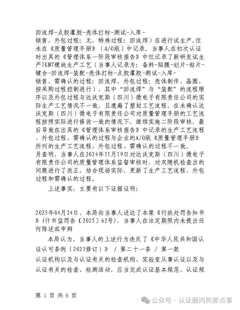 2025年2月,什邡市市场监督管理局接到线索:中亿联合检验认证(成都)有限公司在对达沃克斯(四川)微电子公司的质量管理体系认证中,存在严重违规行为。经调查发现,该公司出具的《管理体系审核报告》中记录的生产工艺流程与企业的《质量管理手册》完全“对不上号”。