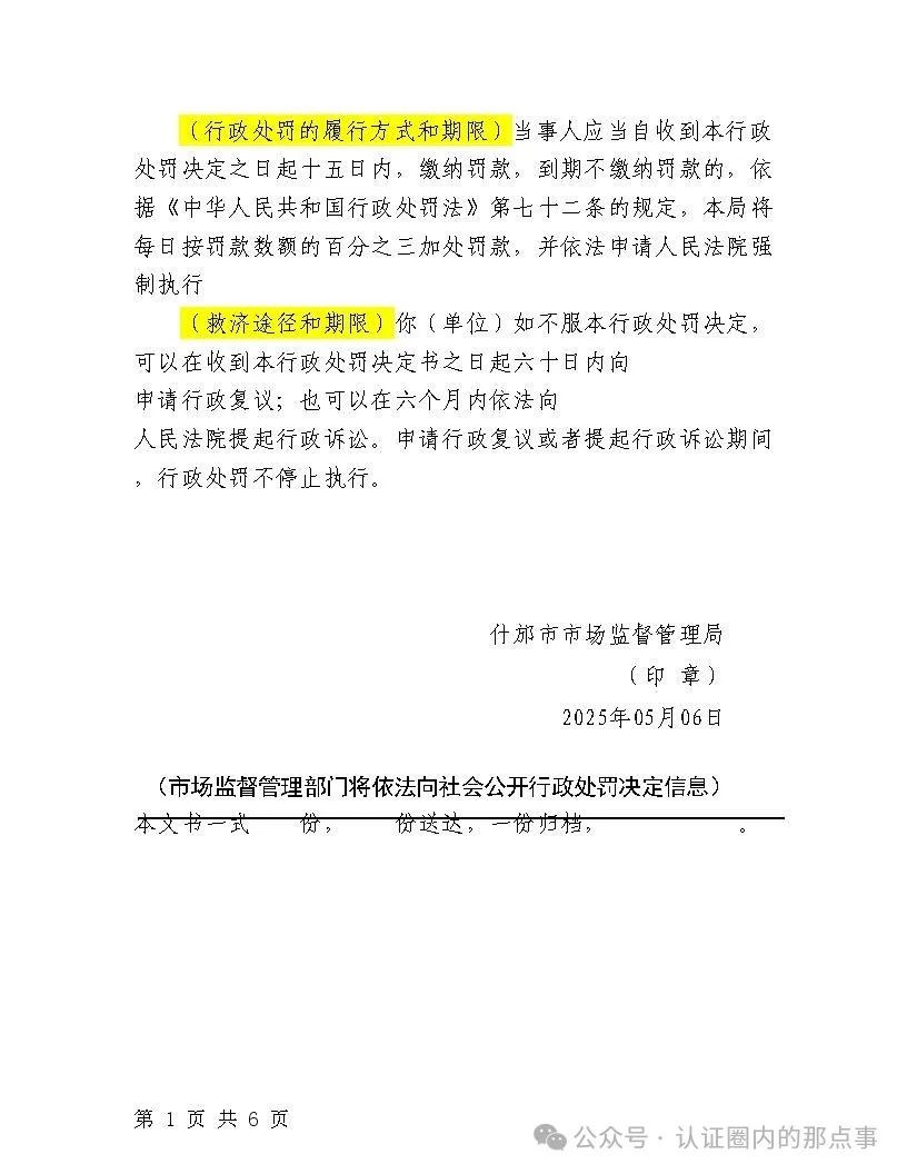 什邡市监局依据《中华人民共和国认证认可条例》第五十九条,对中亿联合检验认证公司开出严厉罚单: